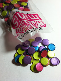 CANDi is a relatively-new crafting embellishment manufactured by Craftwork Cards, based out of the UK. But don't worry, you can still get CANDi at plenty of online stores here in the U.S. :) CANDi pieces are just like brads except without the legs! Instead of being pierced through paper, they get attached using a small foam square.